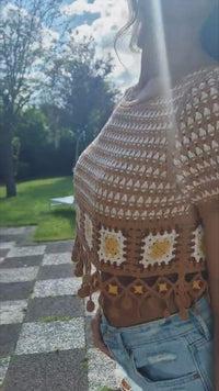 Add a touch of bohemian charm to your festival and beach vacation wardrobe with this adorable crochet crop top. Featuring intricate patterns in warm hues of brown and yellow, this top is designed with a playful fringe hem that adds a fun, free-spirited vibe. The lightweight and breathable crochet fabric ensures comfort on hot summer days, making it perfect for dancing at festivals or lounging by the beach. Pair it with high-waisted shorts or a flowy skirt for an effortlessly chic boho look. This versatile top is a must-have for any free-spirited fashionista’s collection