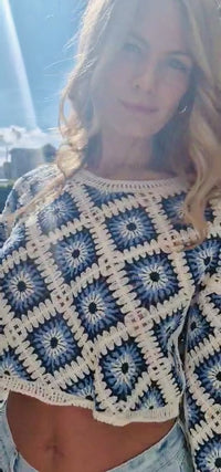 Channel your inner boho chic with our Evil Eye crochet top! Perfect for warding off bad vibes and looking fabulous while doing it 🧿Elevate your summer wardrobe with our Cozy Crochet Crop Top. This charming piece features a classic crochet design with intricate square patterns in shades of blue and white