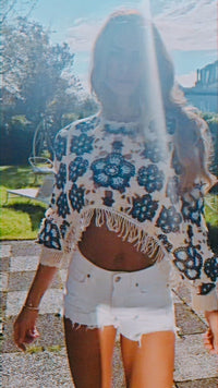 Capture the essence of bohemian style with this charming boho floral crochet crop top. This handmade piece features intricate navy blue and cream floral patterns, beautifully crafted for a unique and eye-catching look. The top’s fringed hem adds a playful touch, perfect for festivals, beach vacations, or casual summer outings. Made from soft, breathable material, it ensures comfort in the heat while the relaxed fit allows for easy movement. Pair it with high-waisted shorts or your favorite jeans for a chic, boho-inspired ensemble. This versatile top is a must-have for any free-spirited fashionista looking to make a statement. Available in blue or bronze