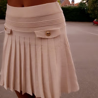 This pleated knit skirt combines a sleek design with comfortable wear. The structured waistband and pleated texture create a flattering silhouette, while the gold button accents on the front add a subtle touch of elegance. Perfect for both casual days and dressier events, this versatile skirt pairs well with tops, sweaters, or blouses